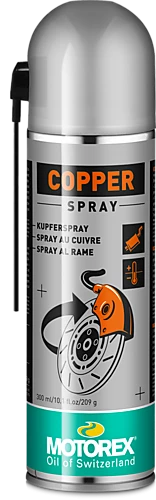 Kopper spray er en spesiell smøring man benytter for å forhindre at mekaniske ubeskyttede deler ”setter seg fast” ved høye temperaturer. Slik som eksosbolter,tennplugger, bremseklosser og varmeskjold. Spray på MOTOREX COPPER før montasje - beskytter mot oksidering og rust - motstandsdyktig til saltvann - passende for bruk mellom -40°C og +1200°C