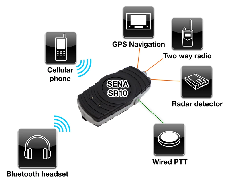 Sena SR10 er et klasse 1 Bluetooth to-veis radio adapter basert på Bluetooth 2.1+EDR teknologi. Du kan koble til forskjellige to-veis radioer til SR10, og kan snakke trådløst ved å koble et Blutooth headset til SR10. SR10 haar to AUX porter som lar deg koble til eksterne enheter uten Bluetooth, som radardetektorer og GPS`er.