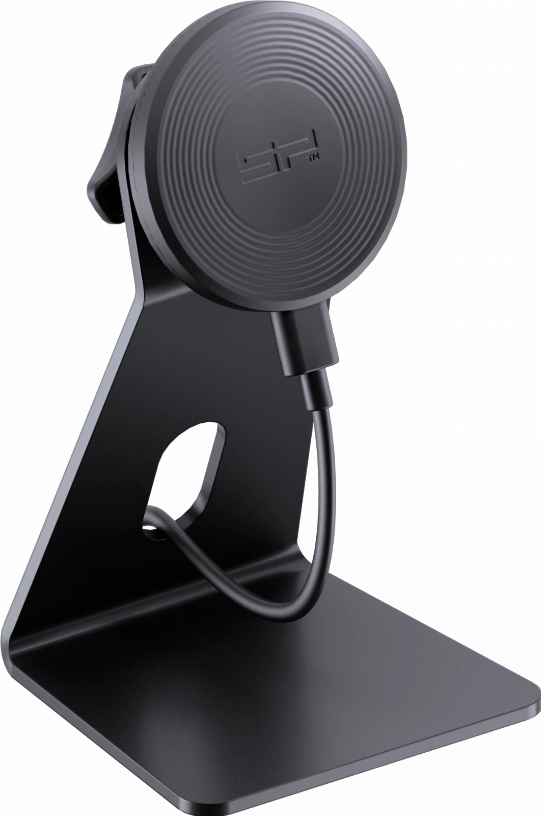 Bordholder med integrert trådløs lader. Integrert trådløs lader. Støtter alle nye trådløse hurtigladeprofiler inkl Magsafe. Telefonen festes til braketten ved hjelp av det integrerte magnetfestet på SPC+ Phone Case.